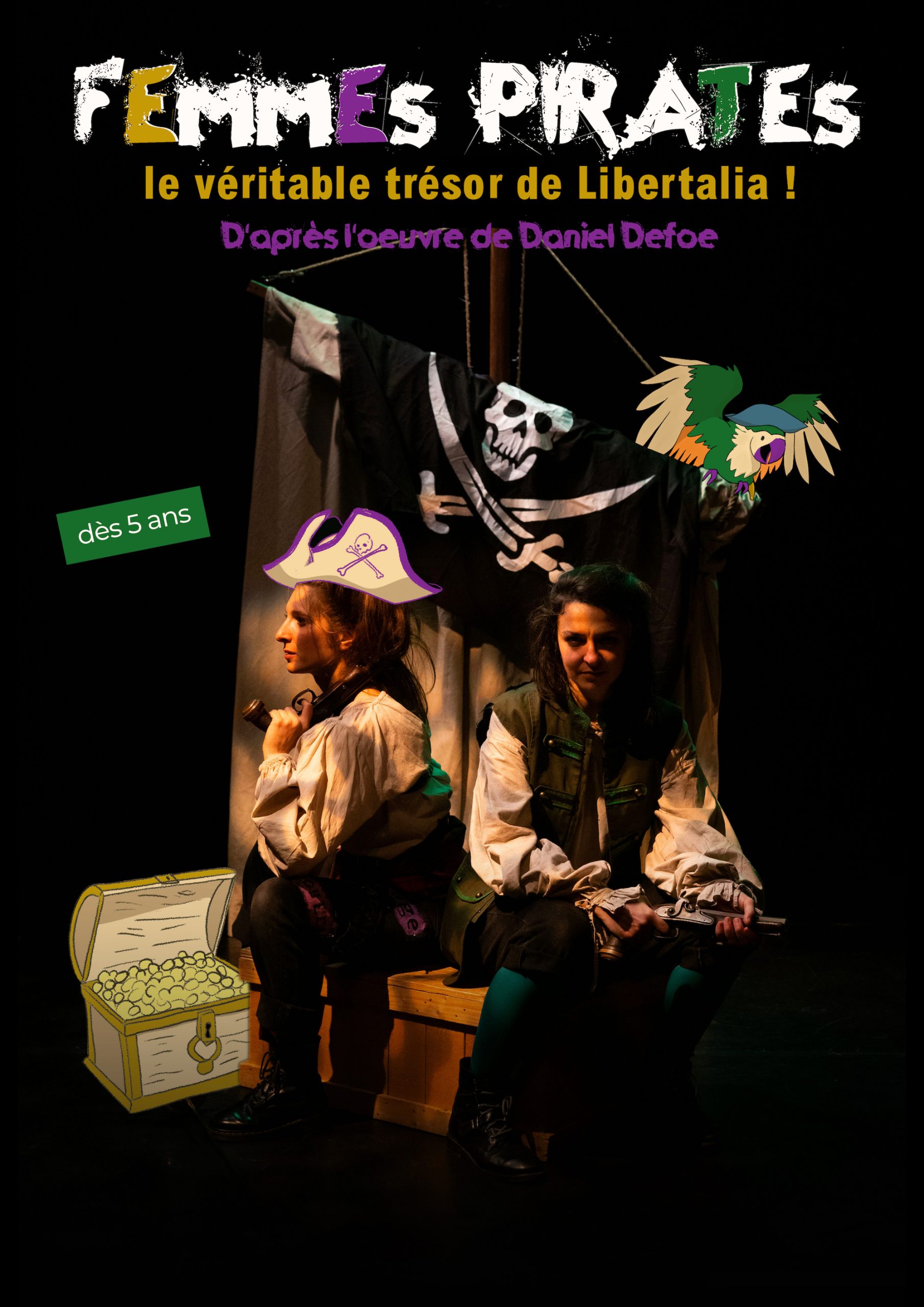 La compagnie La Libellule travaille autour des questions de mémoires et d’identité(s) ; je me suis appuyée sur le récit de deux femmes pirates légendaires, Mary Read et Ann Bonny, et le flou qui règne autour de l’existence de leur vie, pour créer un spectacle jeune public tourné vers la question de la figure féminine dans la piraterie. Le spectacle s’est créé à partir du texte de Daniel Defoe : « L’Histoire Générale des plus fameux Pyrates », Chapitres : « Femmes Pirates & Libertalia ».
